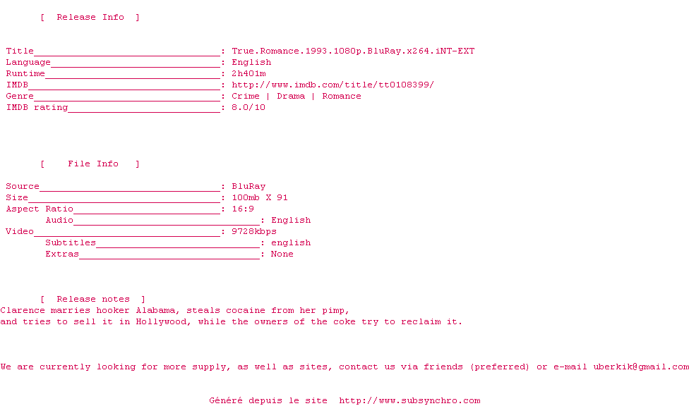 Voir le nfo de la release True.Romance.1993.1080p.BluRay.x264.iNT-EXT