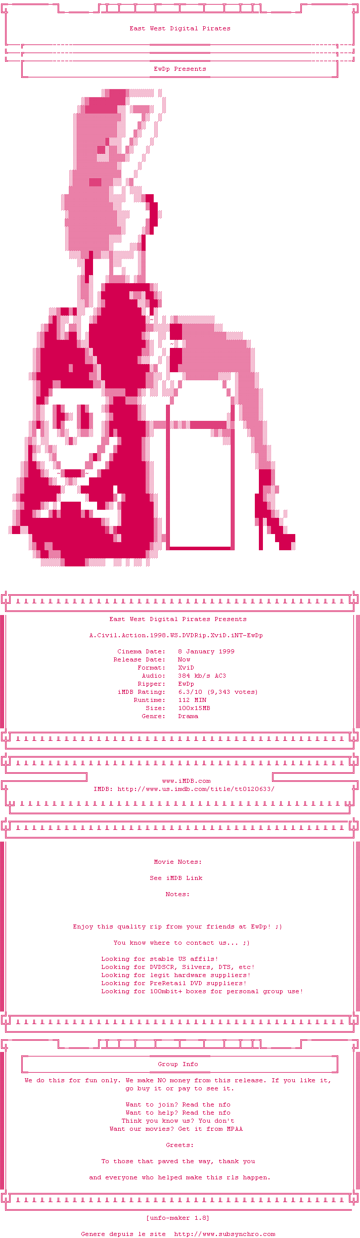 Voir le nfo de la release A.Civil.Action.1998.WS.DVDRip.XviD.INT-EwDp