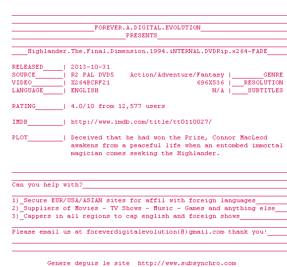 Voir le nfo de la release Highlander.The.Final.Dimension.1994.iNTERNAL.DVDRip.x264-FADE