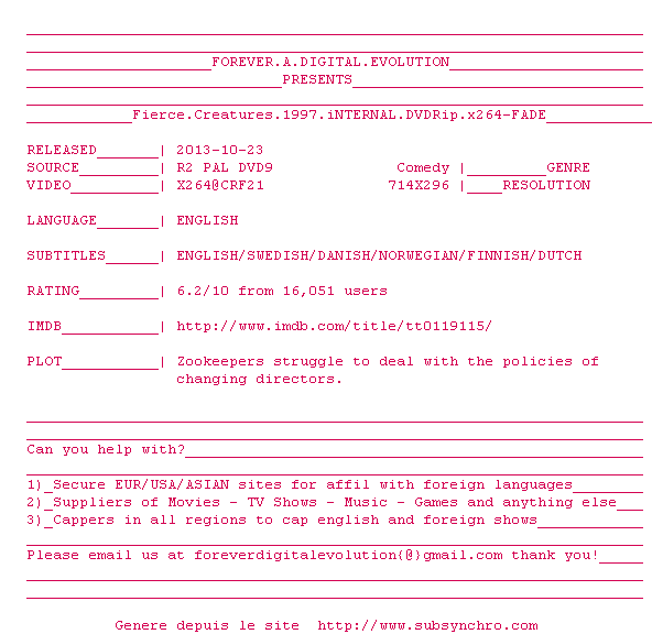 Voir le nfo de la release Fierce.Creatures.1997.iNTERNAL.DVDRip.x264-FADE