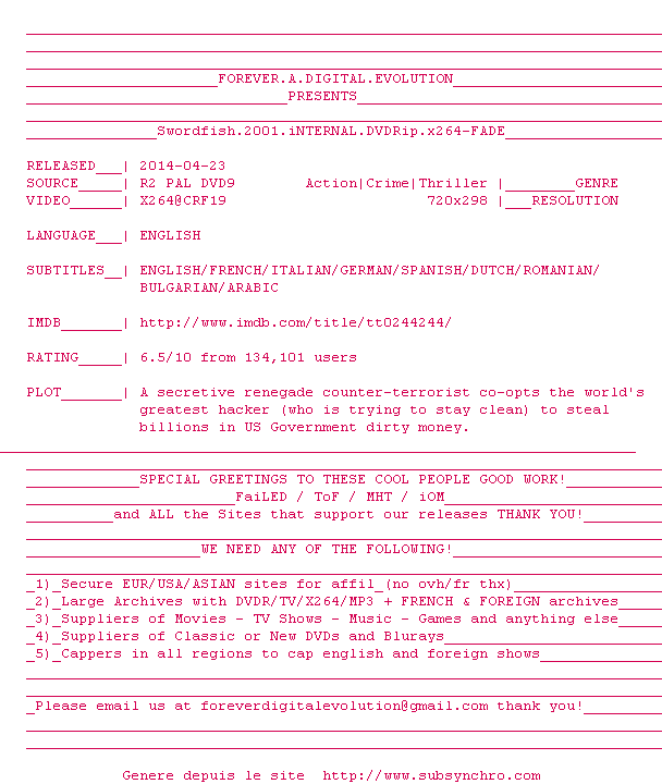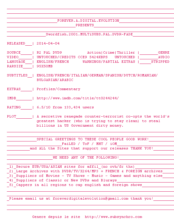 Voir le nfo de la release Swordfish.2001.MULTiSUBS.PAL.DVDR-FADE