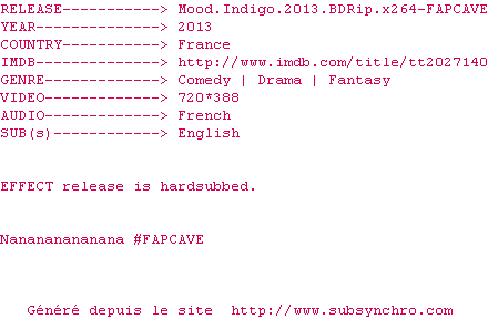Voir le nfo de la release Mood.Indigo.2013.BDRip.x264-FAPCAVE