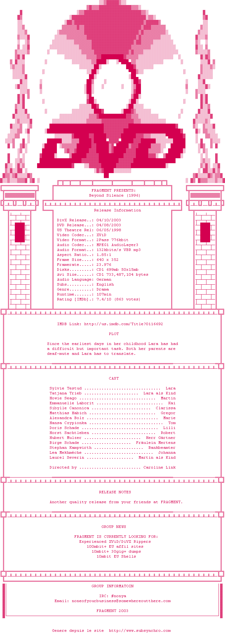 Voir le nfo de la release Beyond.Silence.1996.DVDRip.XviD-FRAGMENT