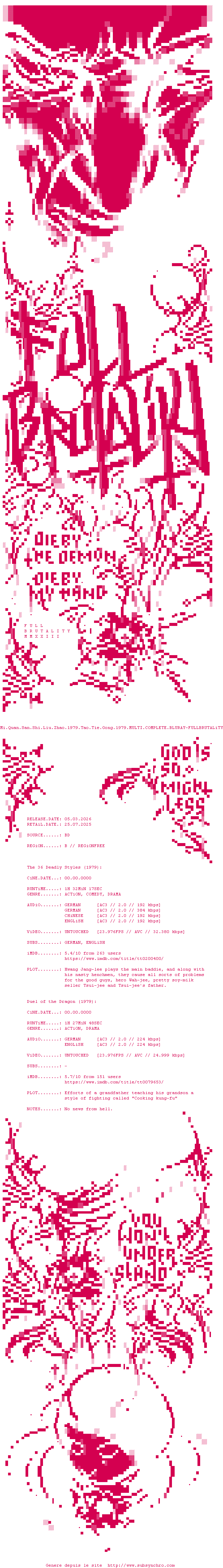 Voir le nfo de la release Mi.Quan.San.Shi.Liu.Zhao.1979.Tao.Tie.Gong.1979.MULTI.COMPLETE.BLURAY-FULLBRUTALiTY