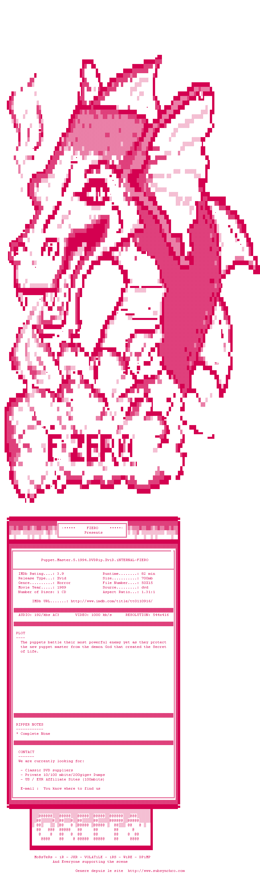 Voir le nfo de la release Puppet.Master.4.1993.DVDRip.XviD.iNTERNAL-FZERO