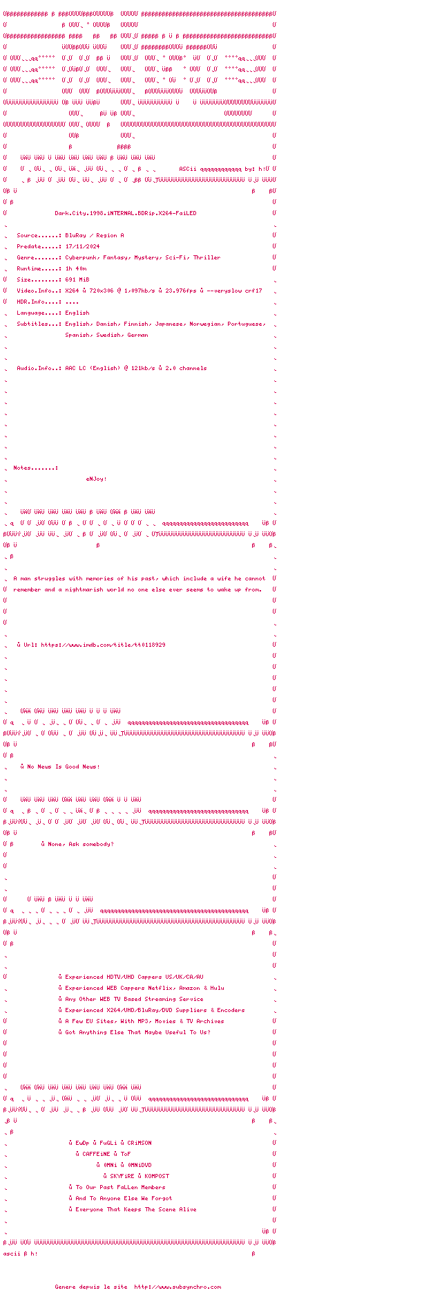 Voir le nfo de la release Dark.City.1998.iNTERNAL.BDRip.x264-FaiLED