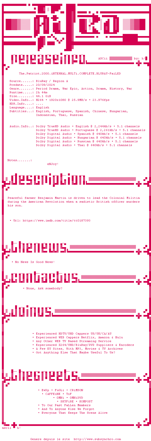 Voir le nfo de la release The.Patriot.2000.iNTERNAL.MULTi.COMPLETE.BLURAY-FaiLED
