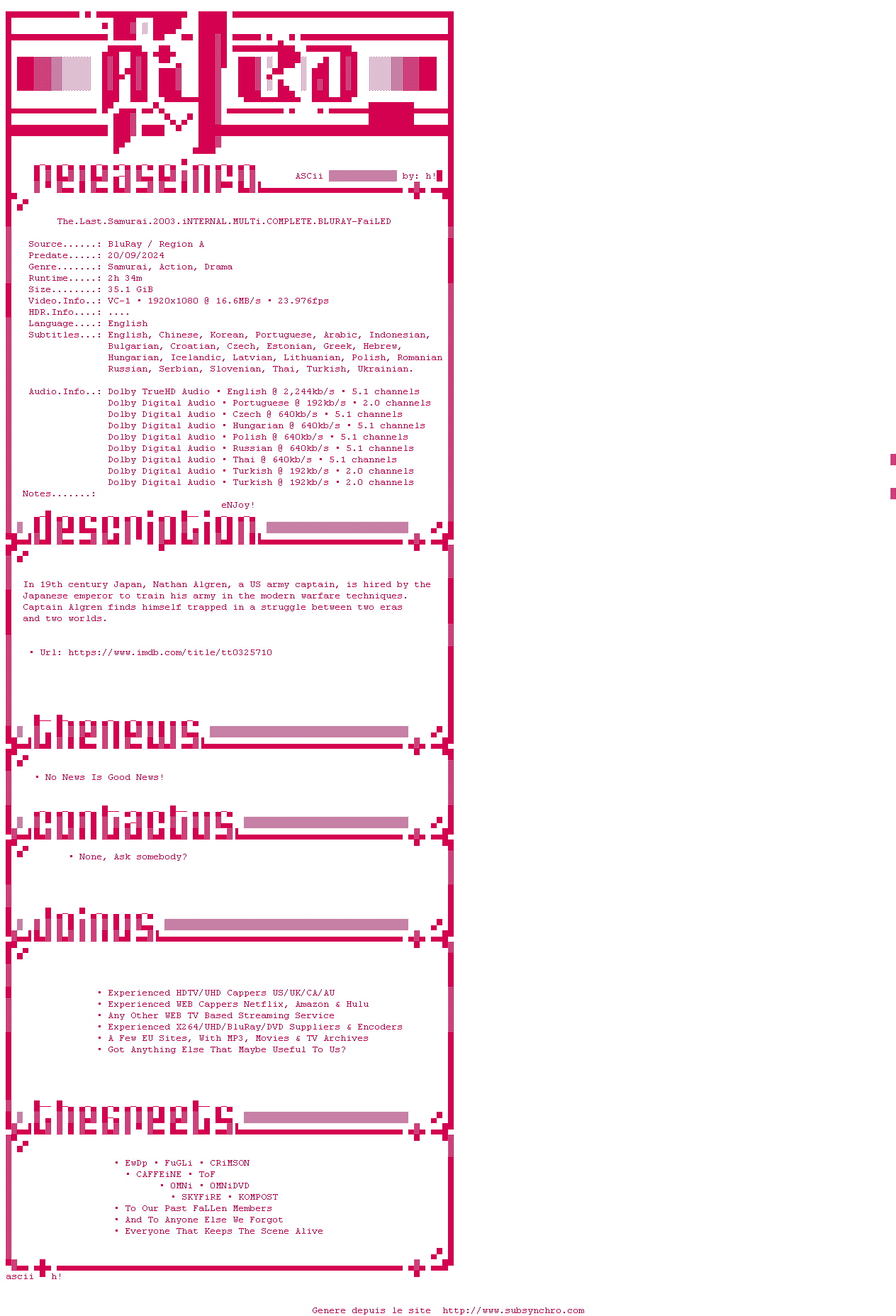 Voir le nfo de la release The.Last.Samurai.2003.iNTERNAL.MULTi.COMPLETE.BLURAY-FaiLED