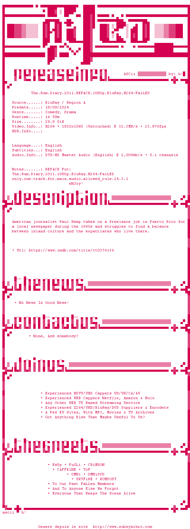 Voir le nfo de la release The.Rum.Diary.2011.REPACK.1080p.BluRay.H264-FaiLED