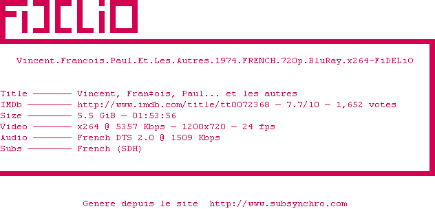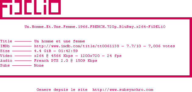 Voir le nfo de la release La.Meilleure.Facon.De.Marcher.1976.FRENCH.720p.BluRay.x264-FiDELiO