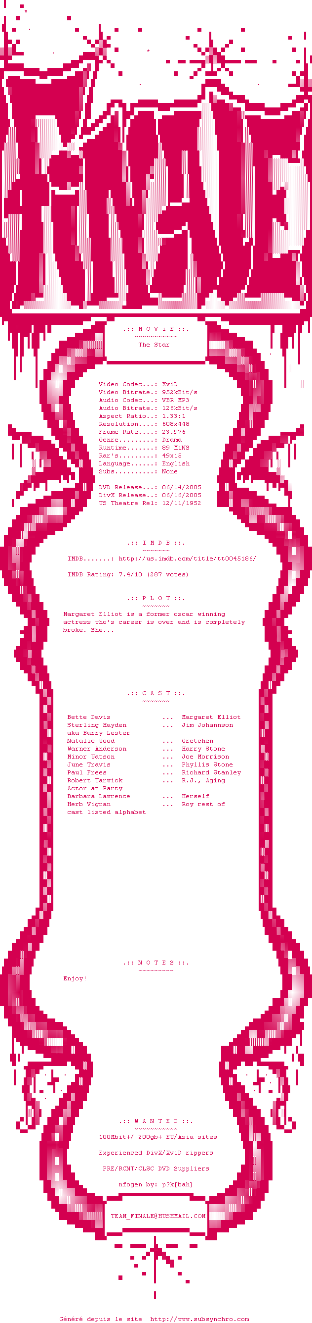 Voir le nfo de la release The.Star.1952.DVDRip.XviD-FiNaLe
