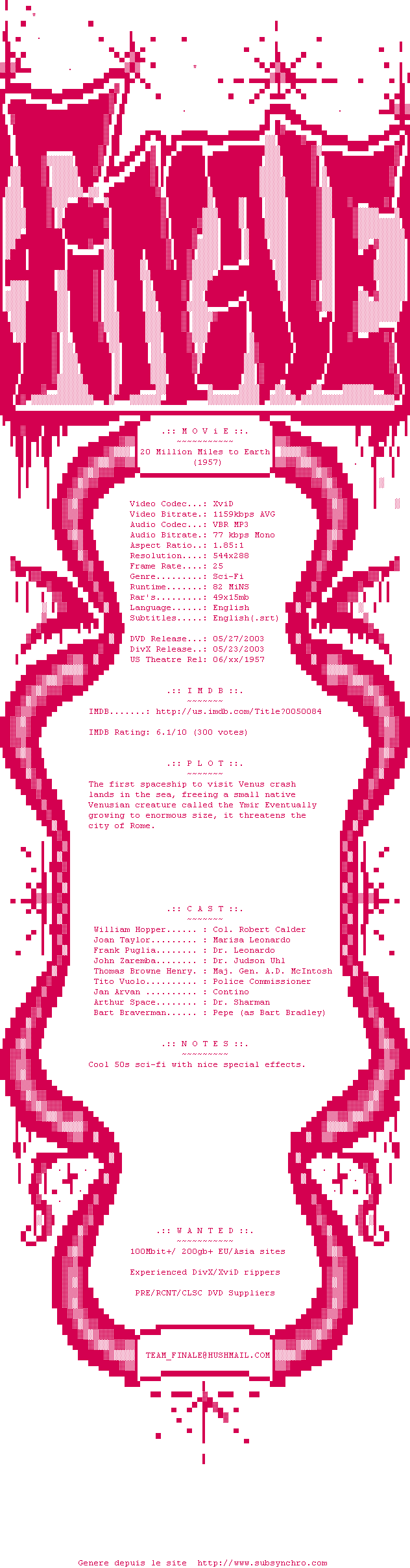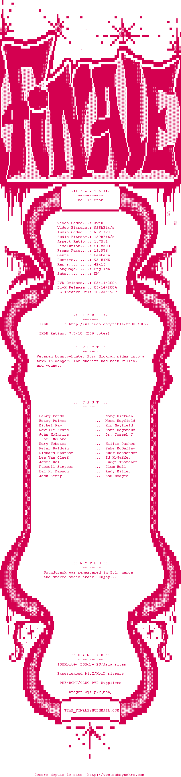 Voir le nfo de la release The.Tin.Star.1957.DVDRip.XviD-FiNaLe