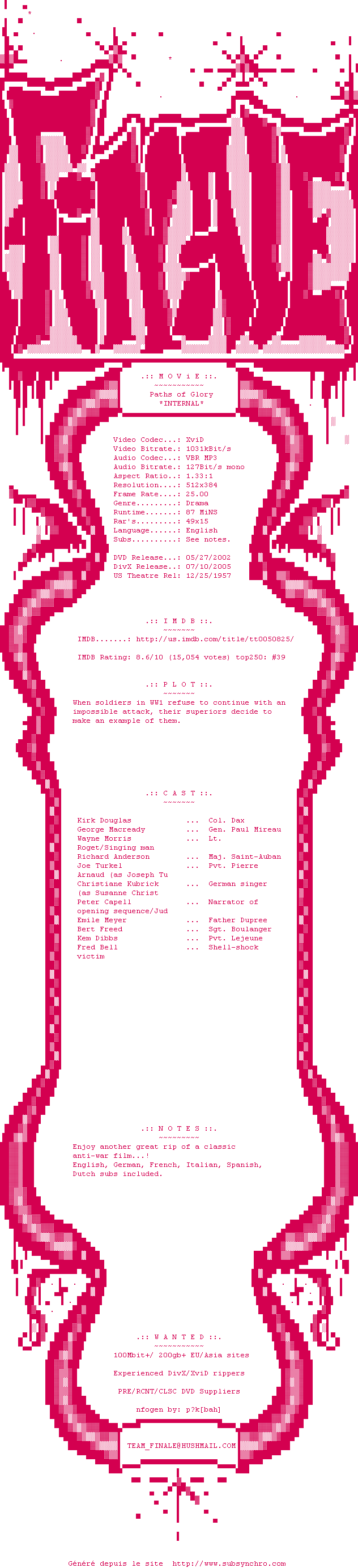 Voir le nfo de la release Paths.Of.Glory.1957.INTERNAL.DVDRip.XviD-FiNaLe