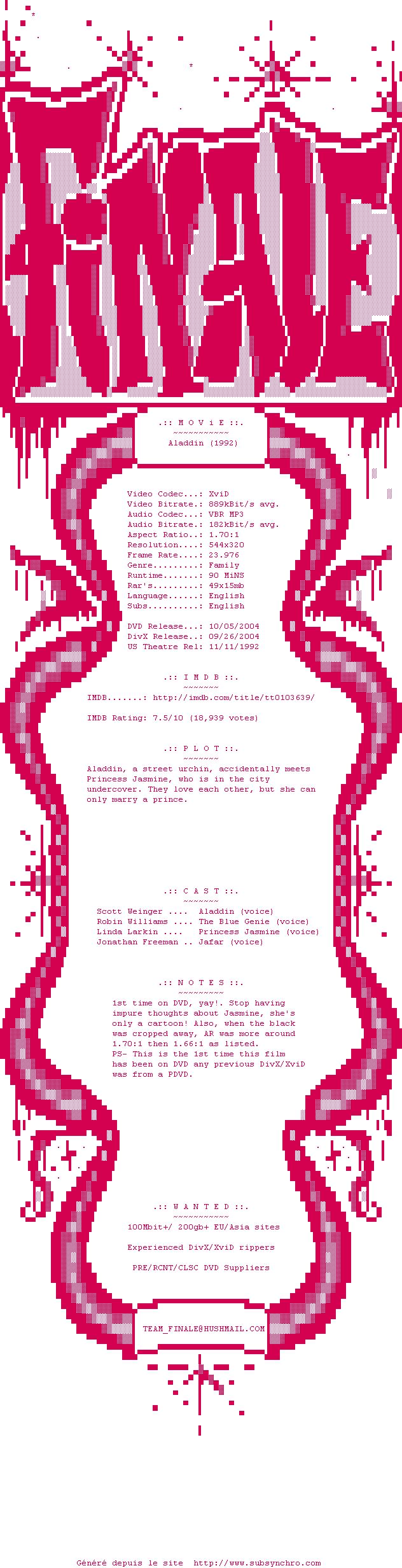 Voir le nfo de la release Aladdin.1992.DVDRip.XviD-FiNaLe