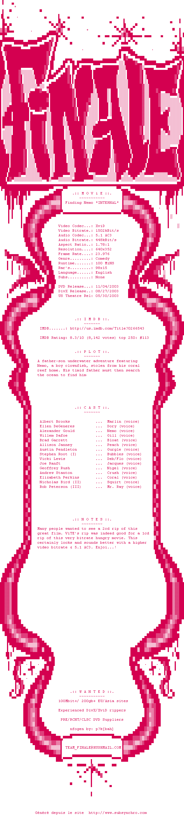 Voir le nfo de la release Finding.Nemo.2003.INTERNAL.DVDRip.XviD-FiNaLe