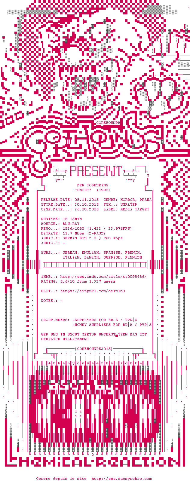 Voir le nfo de la release Der.Todesking.UNCUT.GERMAN.1990.1080p.BluRay.x264-GOREHOUNDS