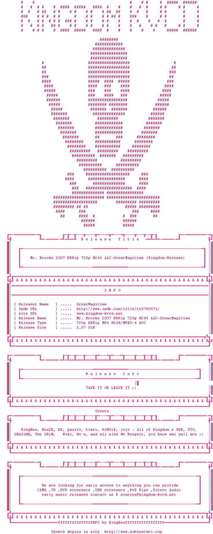 Voir le nfo de la release Mr.Brooks.2007.BRRip.720p.H264.AAC-GreatMagician