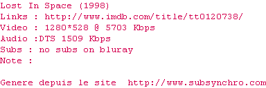 Voir le nfo de la release Lost.In.Space.1998.720p.BluRay.x264-HDCLASSiCS