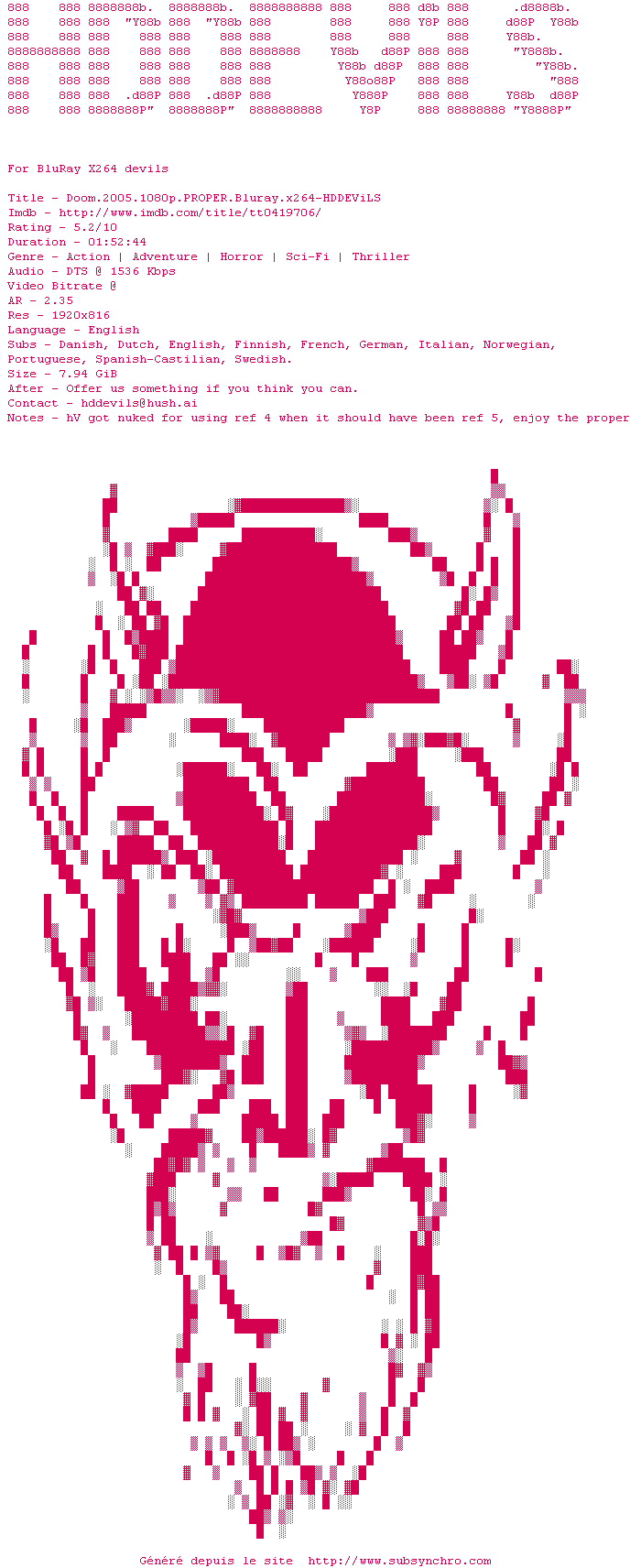 Voir le nfo de la release Doom.2005.1080p.PROPER.BluRay.x264-HDDEViLS