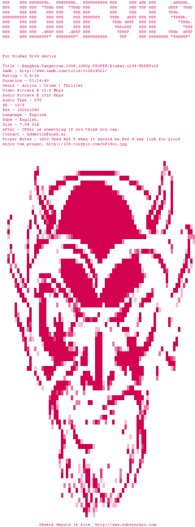 Voir le nfo de la release Bangkok.Dangerous.2008.1080p.PROPER.BluRay.x264-HDDEViLS