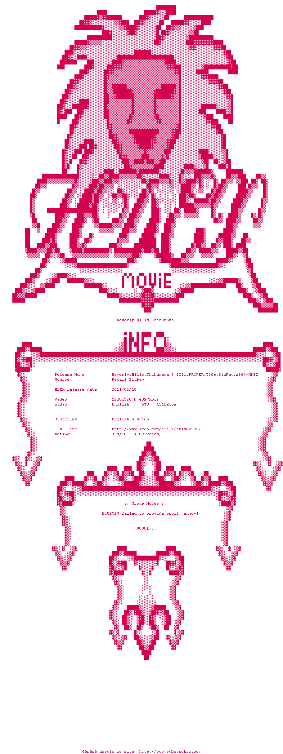 Voir le nfo de la release Beverly.Hills.Chihuahua.2.2011.1080p.BluRay.x264-HDEX