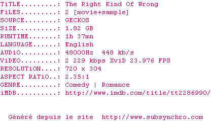 Voir le nfo de la release The.Right.Kind.Of.Wrong.2013.LIMITED.480p.BRRip.XviD.AC3-HDx