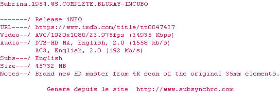 Voir le nfo de la release Sabrina.1954.WS.COMPLETE.BLURAY-INCUBO