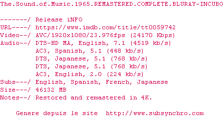 Voir le nfo de la release The.Sound.Of.Music.1965.REMASTERED.COMPLETE.BLURAY-INCUBO