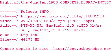 Voir le nfo de la release Night.Of.The.Juggler.1980.COMPLETE.BLURAY-INCUBO