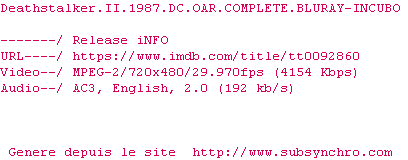 Voir le nfo de la release Deathstalker.II.1987.DC.OAR.COMPLETE.BLURAY-INCUBO