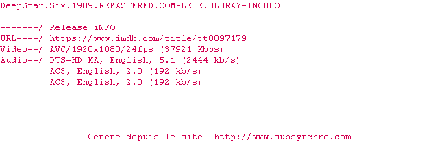 Voir le nfo de la release DeepStar.Six.1989.REMASTERED.COMPLETE.BLURAY-INCUBO