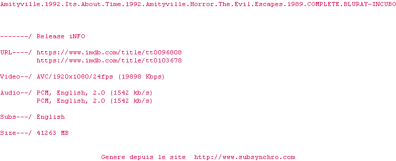 Voir le nfo de la release Amityville.1992.Its.About.Time.1992.Amityville.Horror.The.Evil.Escapes.1989.COMPLETE.BLURAY-INCUBO