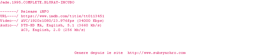 Voir le nfo de la release Jade.1995.COMPLETE.BLURAY-INCUBO