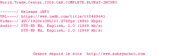 Voir le nfo de la release World.Trade.Center.2006.OAR.COMPLETE.BLURAY-INCUBO