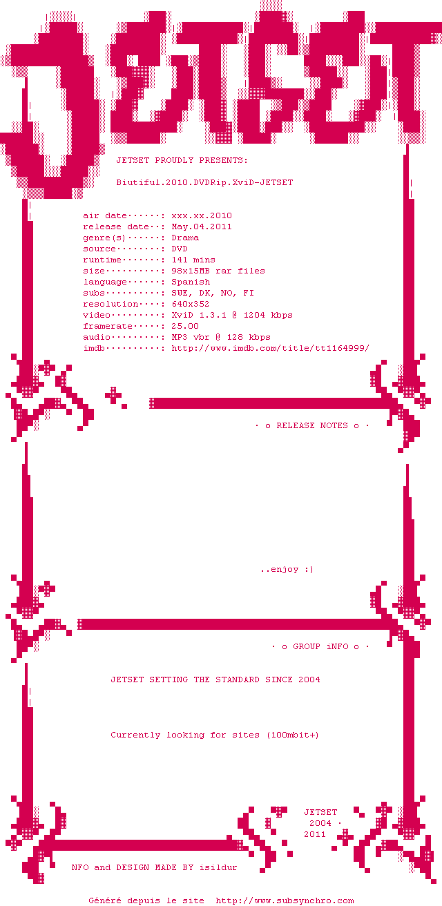 Voir le nfo de la release Biutiful.2010.DVDRip.XviD-JETSET