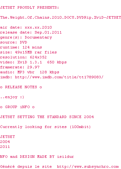 Voir le nfo de la release The.Weight.Of.Chains.2010.DOCU.DVDRip.XviD-JETSET
