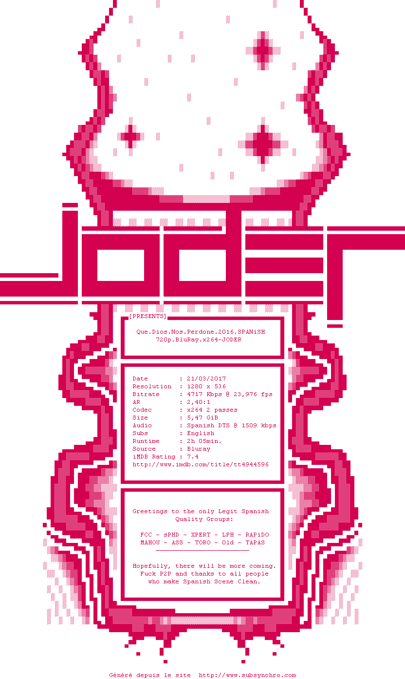 Voir le nfo de la release Cien.Anyos.De.Perdon.2016.SPANiSH.BDRip.x264-JODER