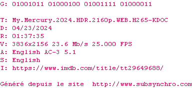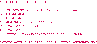 Voir le nfo de la release My.Mercury.2024.HDR.2160p.WEB.H265-KDOC