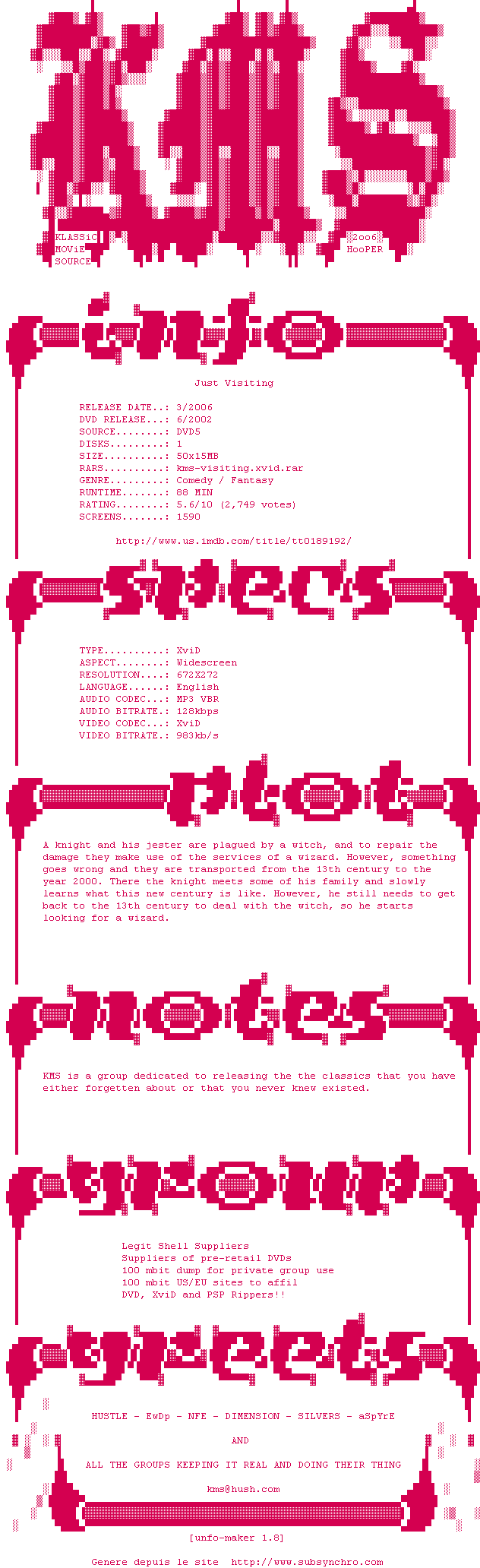Voir le nfo de la release Just.Visiting.2001.DVDRip.XviD.iNTERNAL-KMS