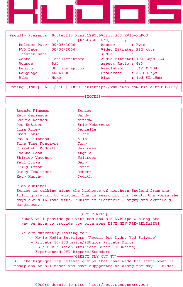 Voir le nfo de la release Butterfly.Kiss.1995.DVDrip.AC3.XVID-KuDoS