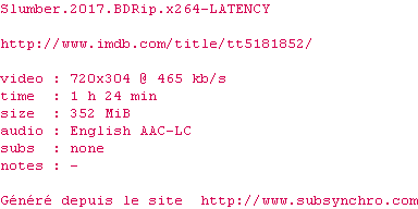 Voir le nfo de la release Slumber.2017.BDRip.x264-LATENCY