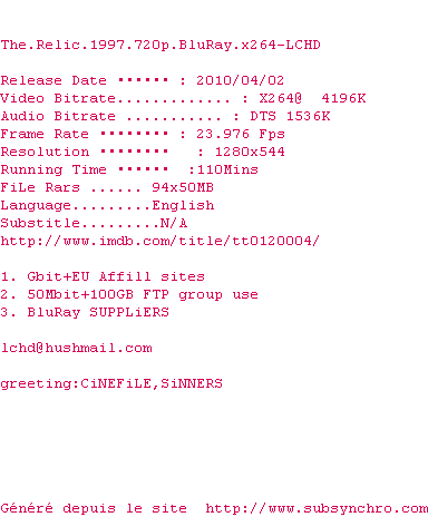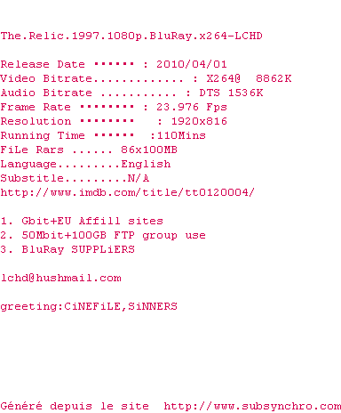 Voir le nfo de la release The.Relic.1997.1080p.BluRay.x264-LCHD