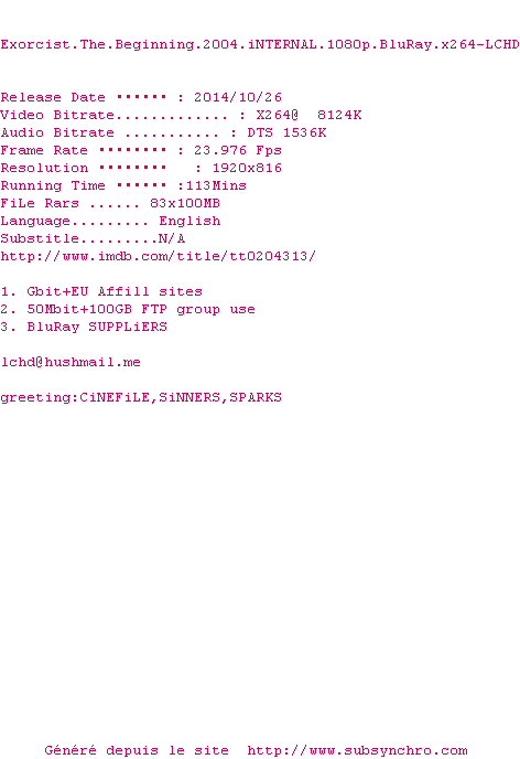 Voir le nfo de la release Exorcist.The.Beginning.2004.iNTERNAL.1080p.BluRay.x264-LCHD