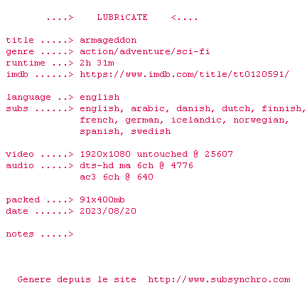 Voir le nfo de la release Armageddon.1998.1080p.BluRay.H264-LUBRiCATE