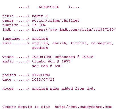 Voir le nfo de la release Taken.2.2012.EXTENDED.1080p.BluRay.H264-LUBRiCATE