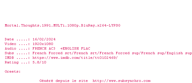 Voir le nfo de la release Mortal.Thoughts.1991.MULTi.1080p.BluRay.x264-LYPSG