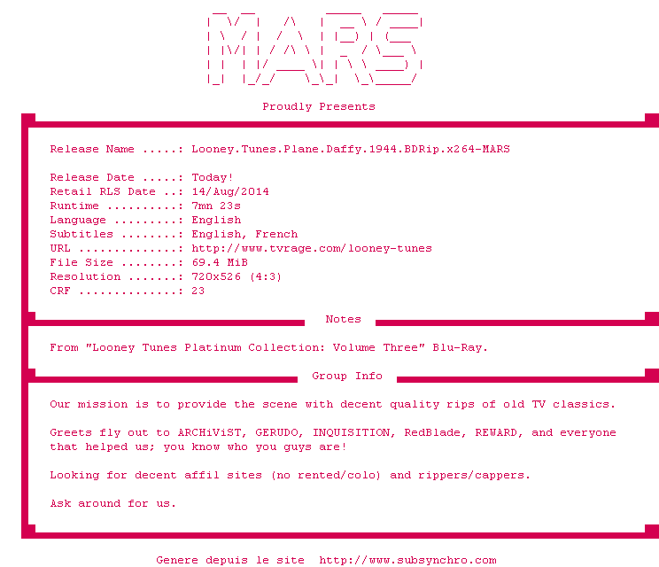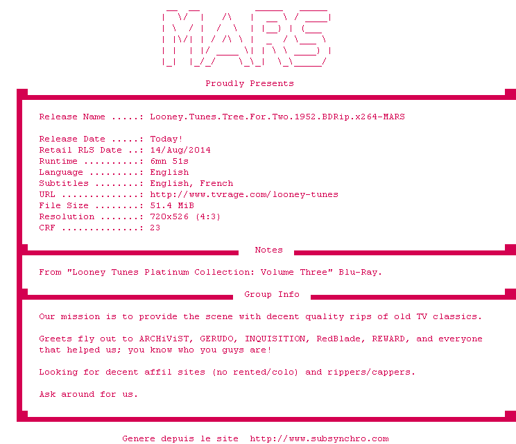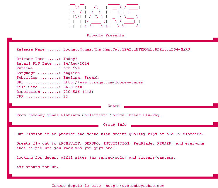 Voir le nfo de la release Looney.Tunes.Canary.Row.1950.REMASTERED.READNFO.BDRip.x264-MARS