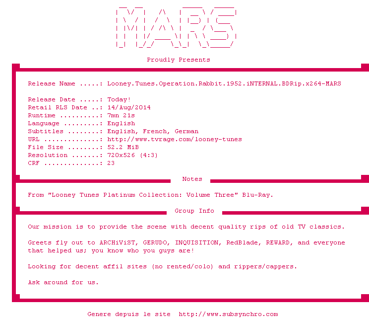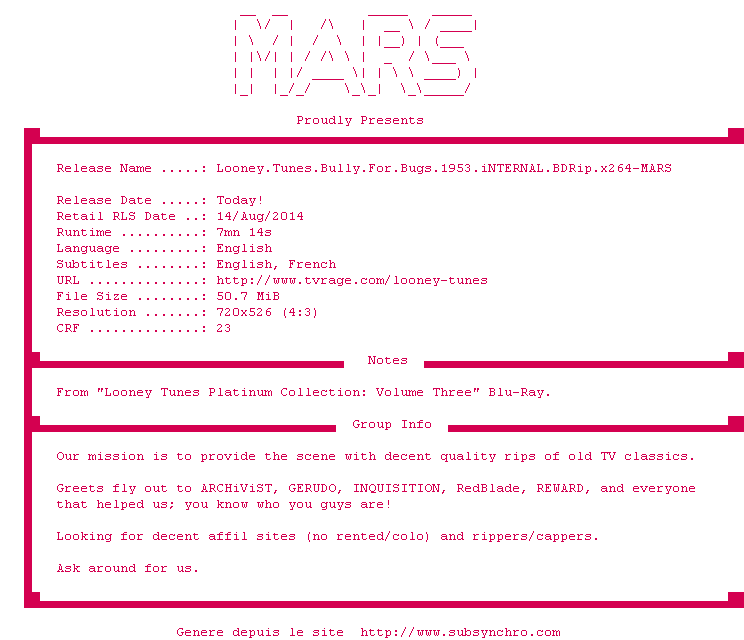 Voir le nfo de la release Looney.Tunes.Bugs.And.Thugs.1954.iNTERNAL.BDRip.x264-MARS