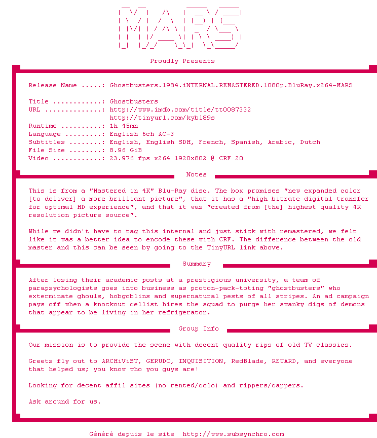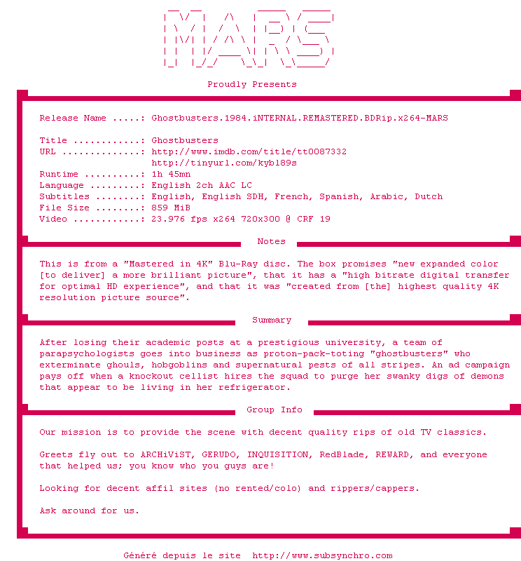 Voir le nfo de la release Ghostbusters.1984.iNTERNAL.REMASTERED.1080p.BluRay.x264-MARS