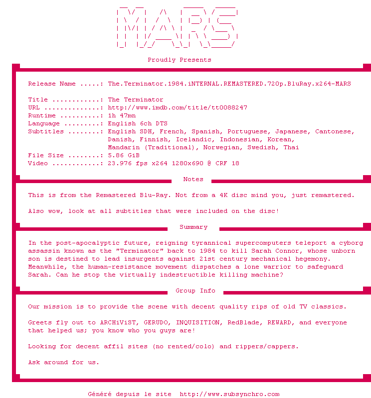 Voir le nfo de la release The.Terminator.1984.iNTERNAL.REMASTERED.720p.BluRay.x264-MARS